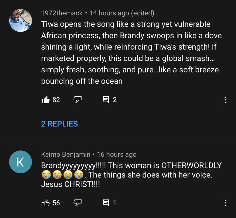 Quote from: Saving All My Rigs on August 20, 2021, 10:24:00 AMQuote from: Harlem on August 20, 2021, 09:08:21 AMQuote from: Saving All My Rigs on August 20, 2021, 09:06:19 AMQuote from: Harlem on August 20, 2021, 09:04:48 AMBrandy, Queen... King. This nonstop lashing The message, the vocals, this sad/beautifully made Afro-beat tune... the way you wanna dance but fake be hopeful at the same time... wtf!!!! !!!!!!You play it on those speakers of yours yet? When i did that earlier i literally started dancing and I'm not a dancer like that You just can't help it Tiwa sets the tone perfectly in that opening verse. It's all SO melodic